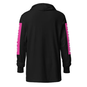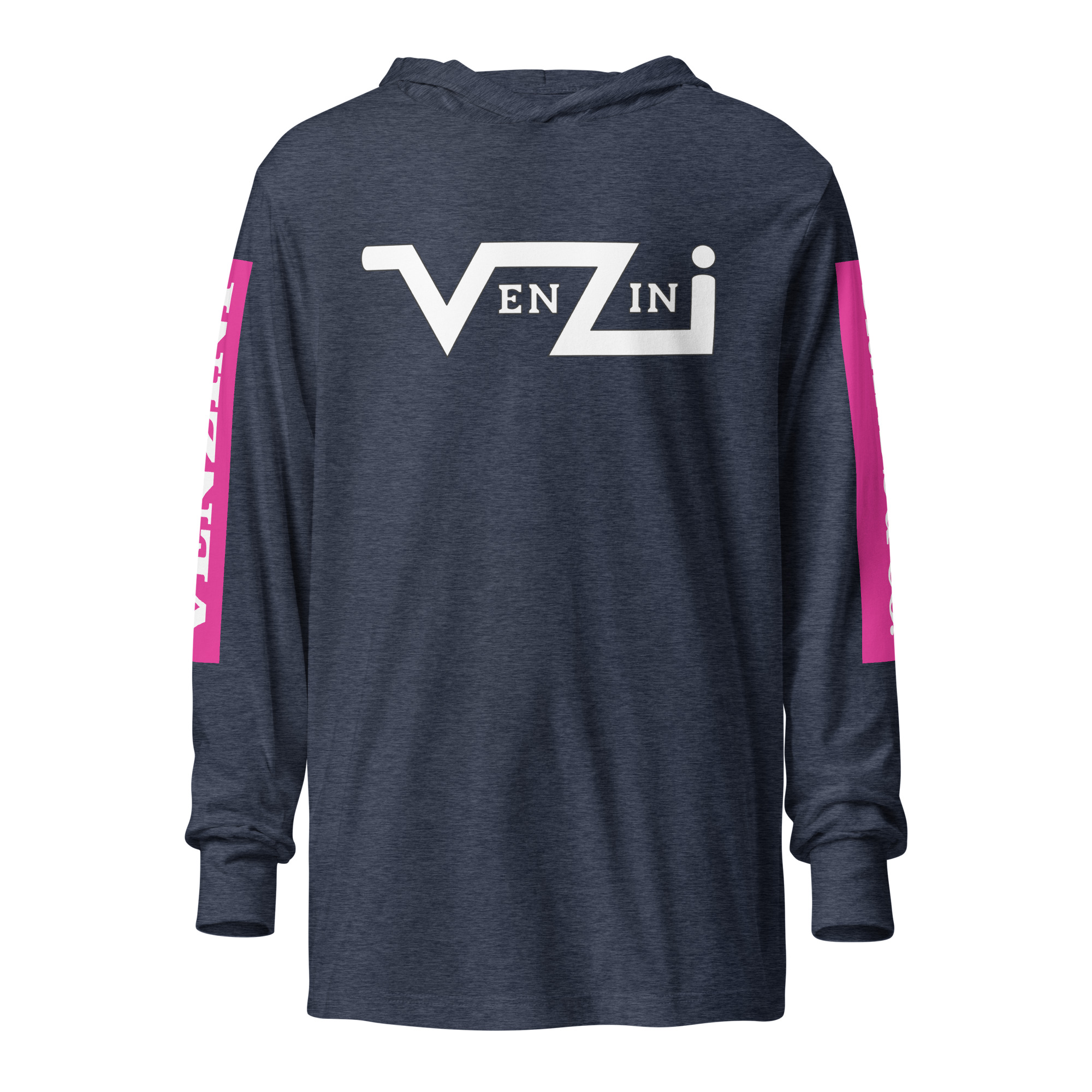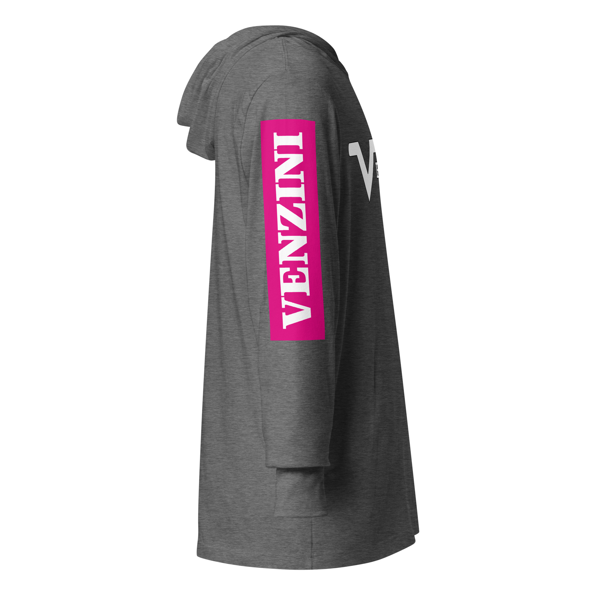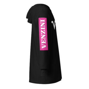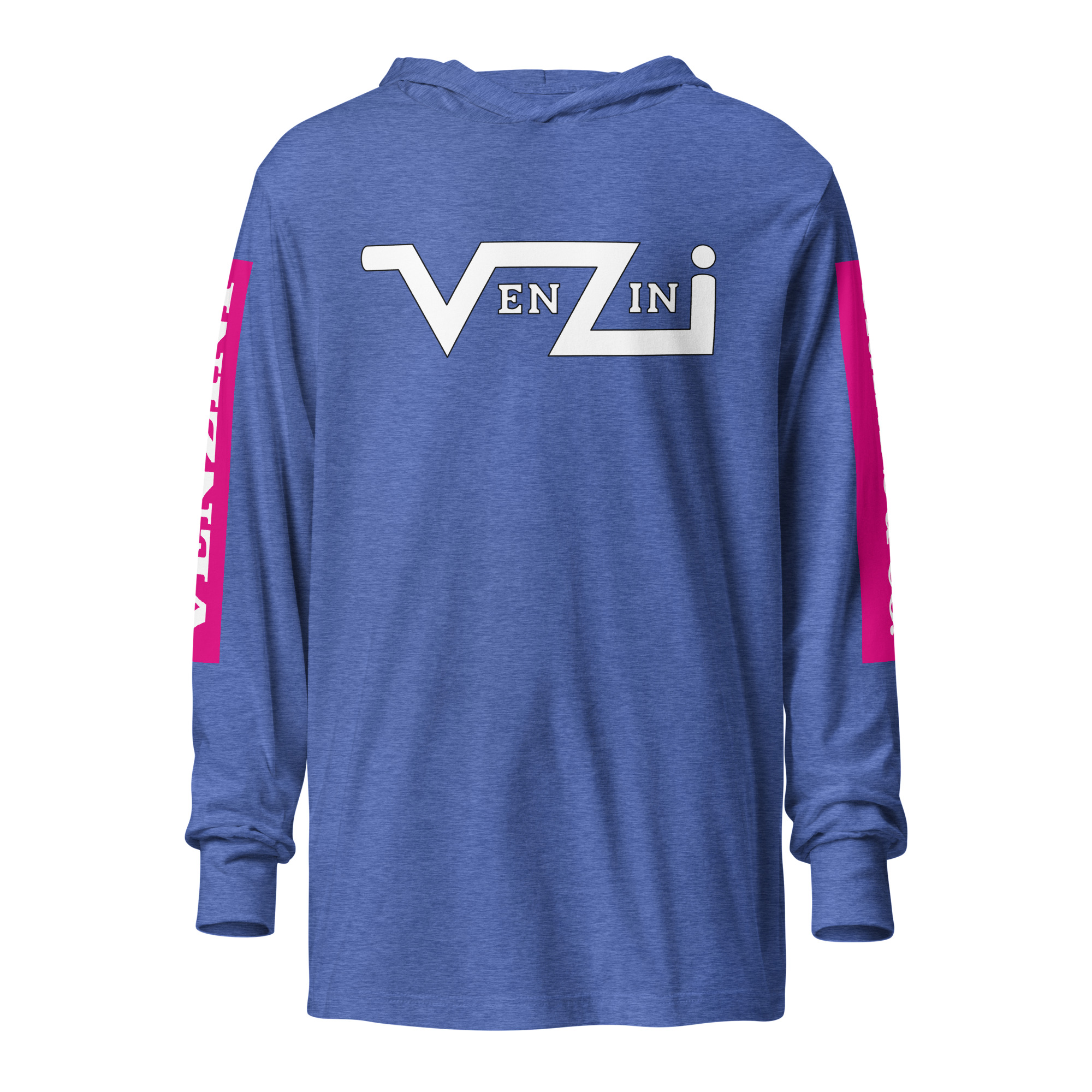 Be the first to review “VENZINI WHITE – Hooded Long-Sleeve Tee w/Fuchsia Pink Sleeve Background)”